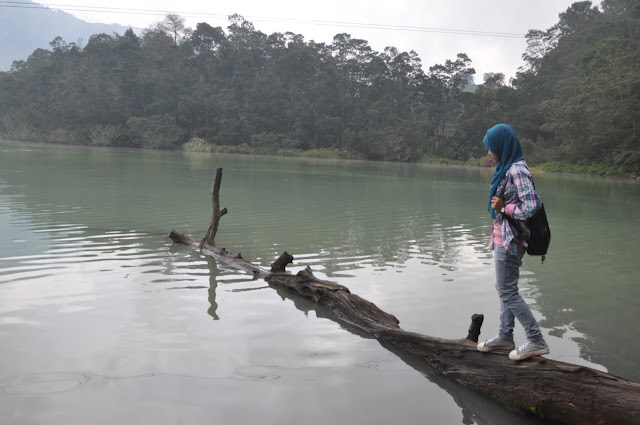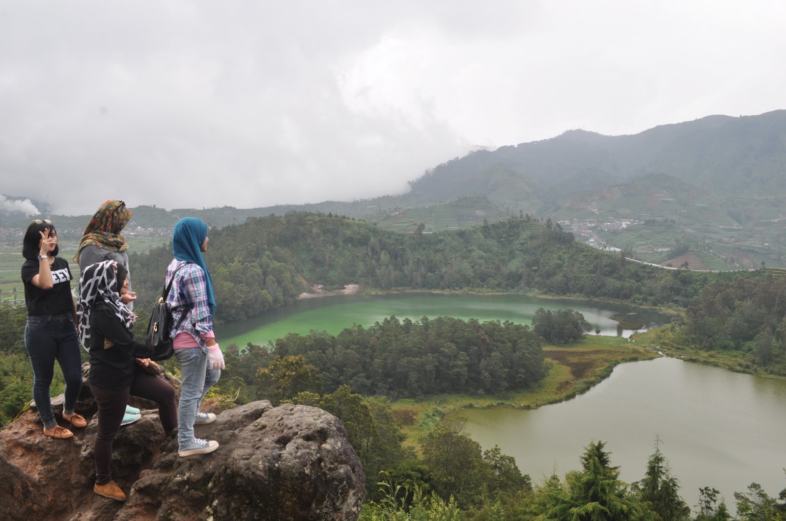 setelah mandi, kami terbagi menjadi dua tim berdasarkan mobil. aku dan Mira ikut Mas Agung dan Junet, sementara mobil kedua isinya Mas Ferry dan Onit sang kekasih. Di perjalanan menuju Dieng, kami diajak untuk mengunjungi Telaga Menjer. Hanya bayar beberapa ribu rupiah saja, kami sudah bisa menghirup udara segar dan menikmati pemandangan yang menyejukan jiwa raga, cieeh. Kami sempat berfoto di ujung perahu dan haha hihi di atas ombak yang tenang, tiba-tiba byuuuuur…. hujan besar membuat kami terkatung-katung di atas perahu selama lebih dari satu jam.